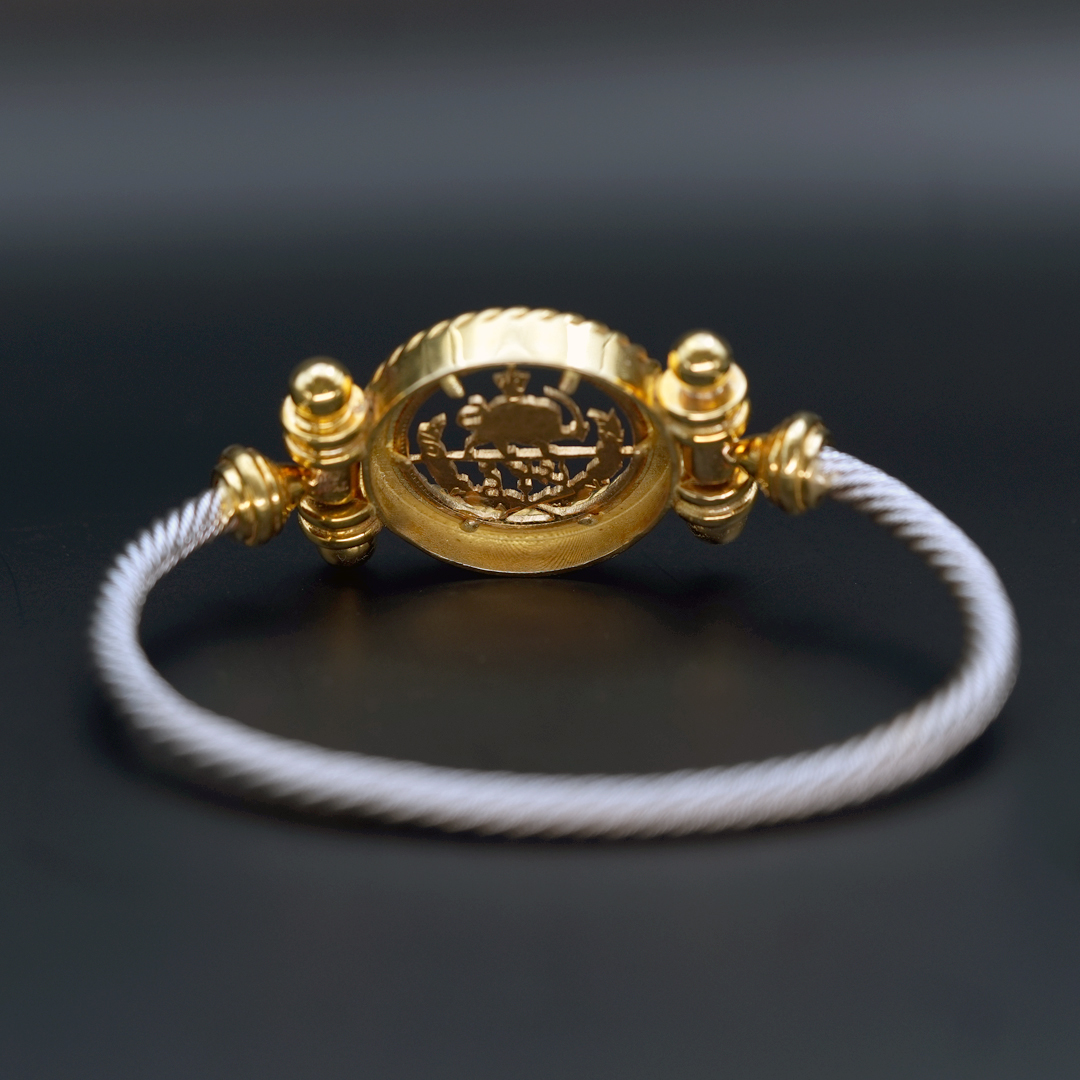 دستبند پهلوی از سکه نیم پهلوی و با اره کاری دست ساخته شده است.